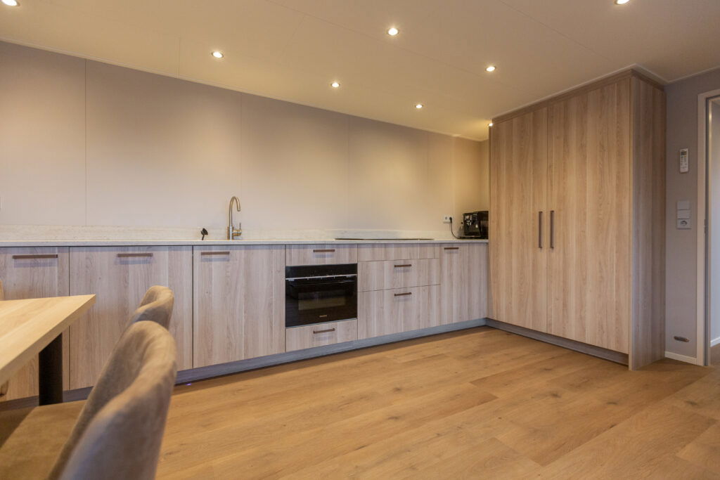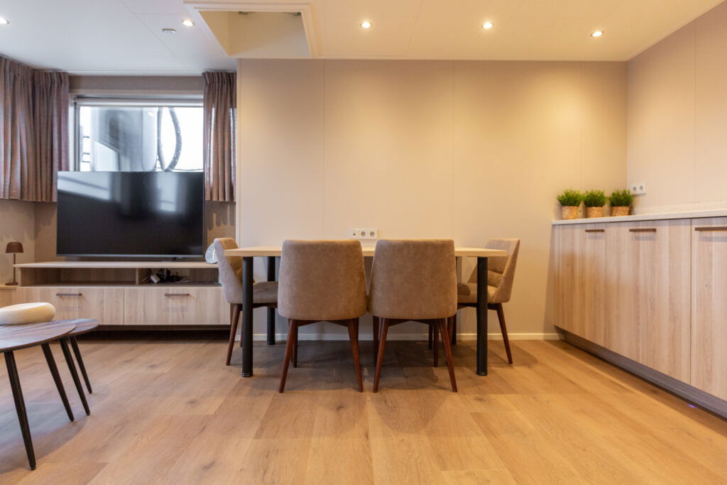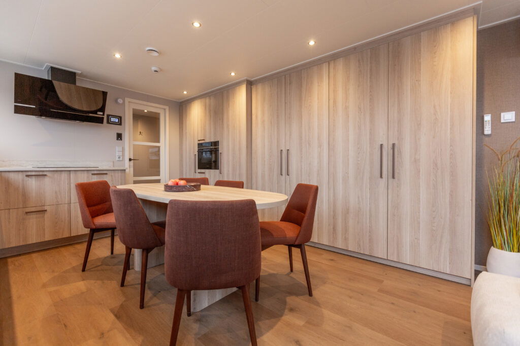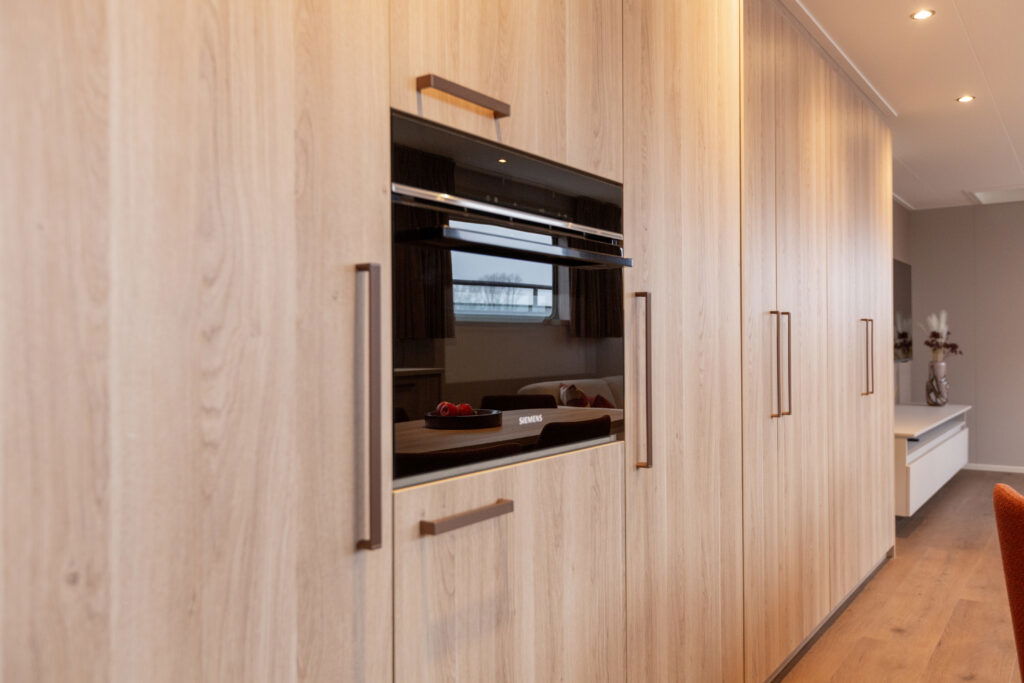 Bij de maatwerkbetimmering van de Birjo is gekozen voor een lichte houttint. Dit zorgt voor een neutrale basis. Elementen in een koperkleur, een tapijt en marmeren details zorgen voor het contrast en de warmte.