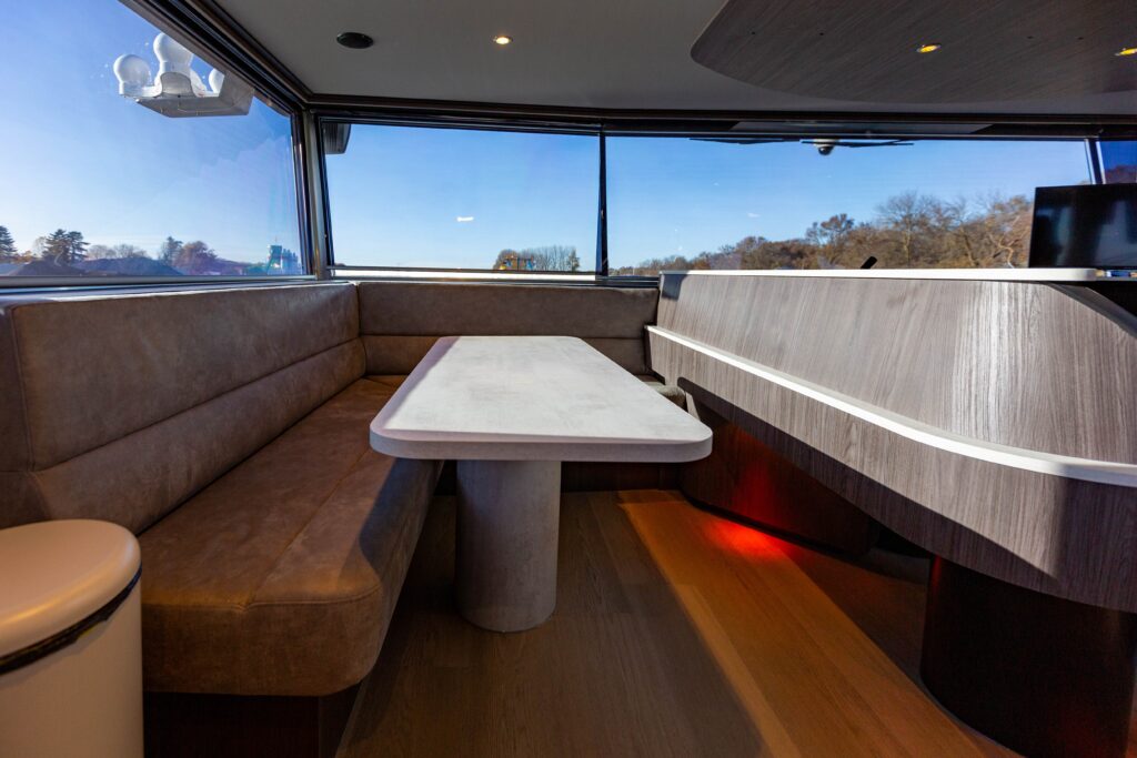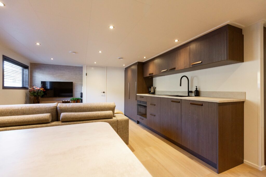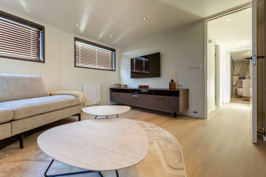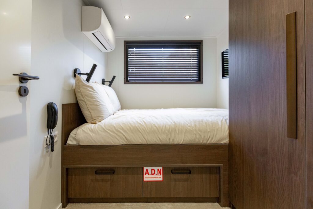 Deze 110 meter lange inland tanker straalt pure rust uit. Wij ontwikkelden samen met de klant vooraf een compleet interieurconcept.