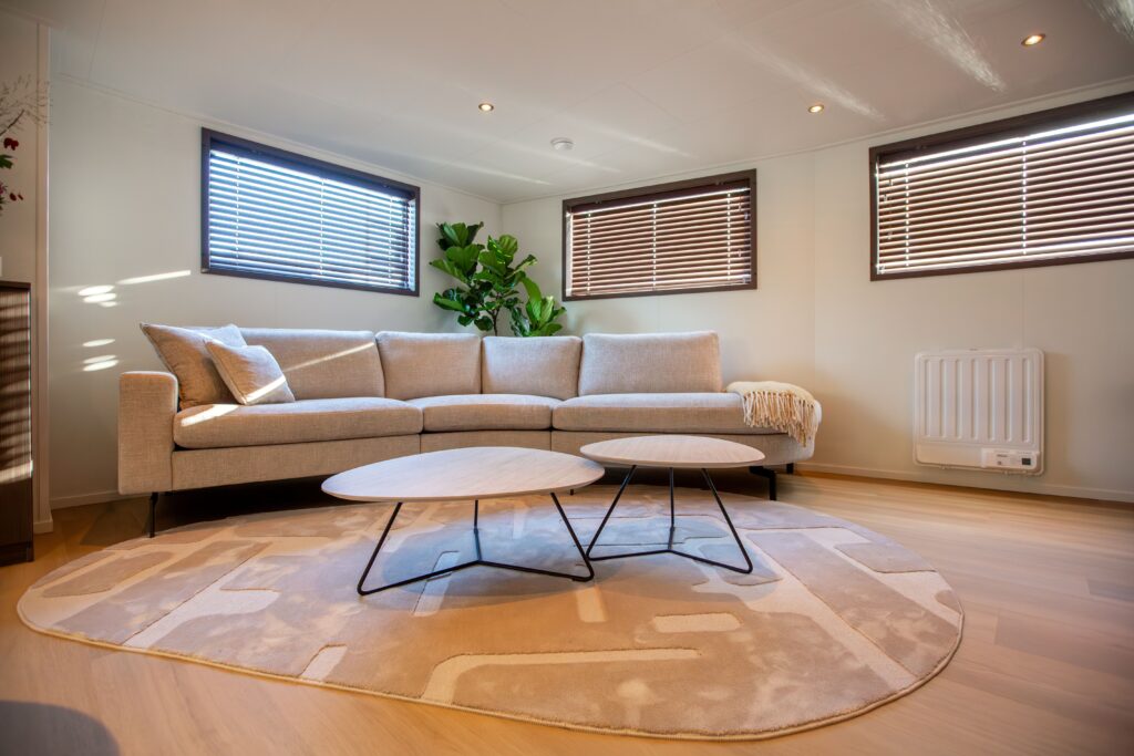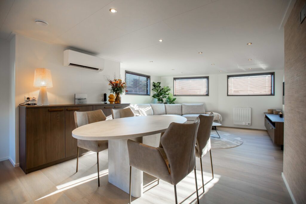 De meubels zijn juist licht van kleur en dit maakt het, samen met de ovalen tafel geheel eigentijds en helemaal van nu.